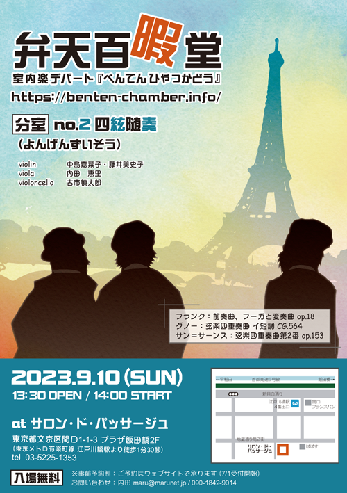 〈弁天〉弦楽四重奏の館、2年目はみなさんがよく知るドビュッシー&ラヴェル以前の、「え、この人もクァルテット書いてたの?」的な作品をご紹介します。そう、会場名もフランス語でちょうどよいかと!